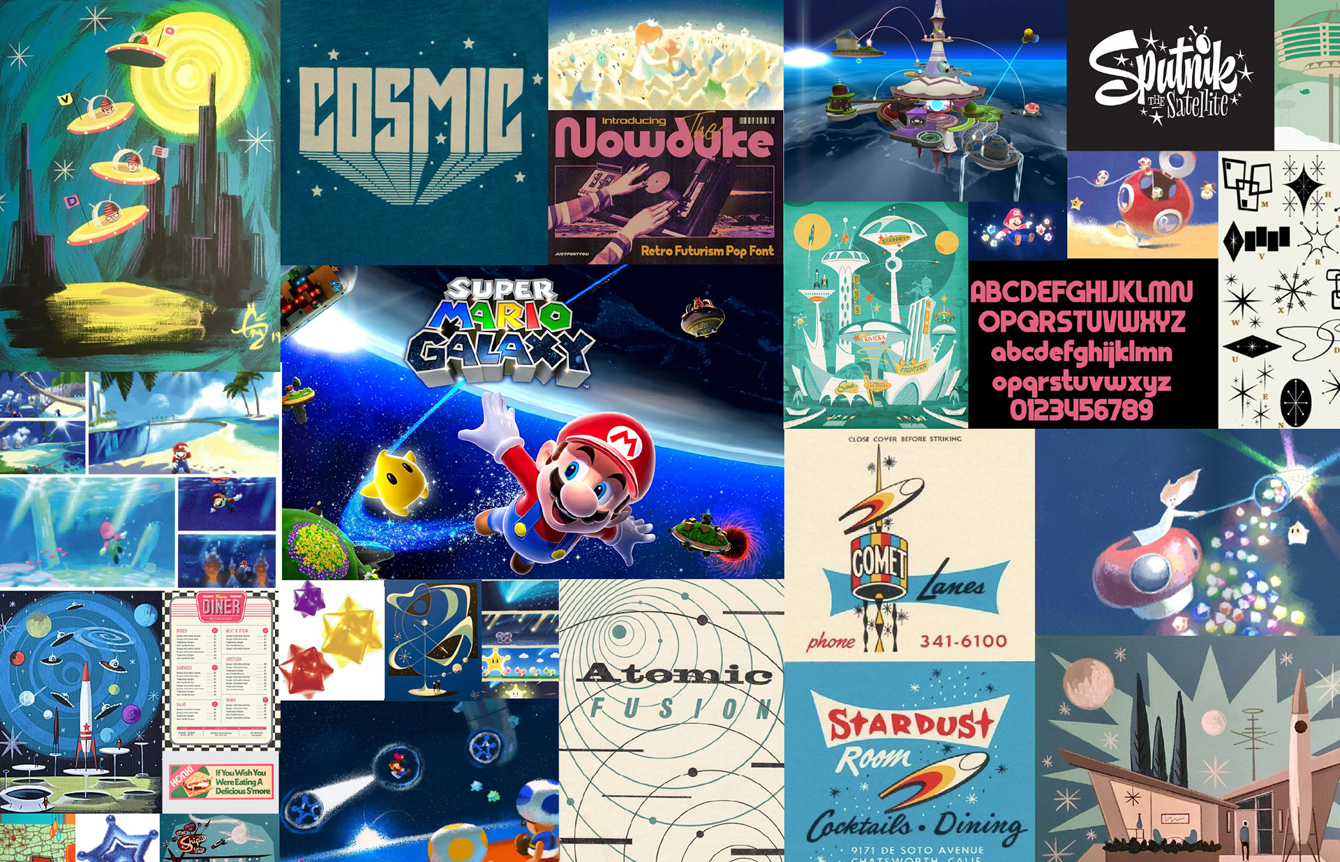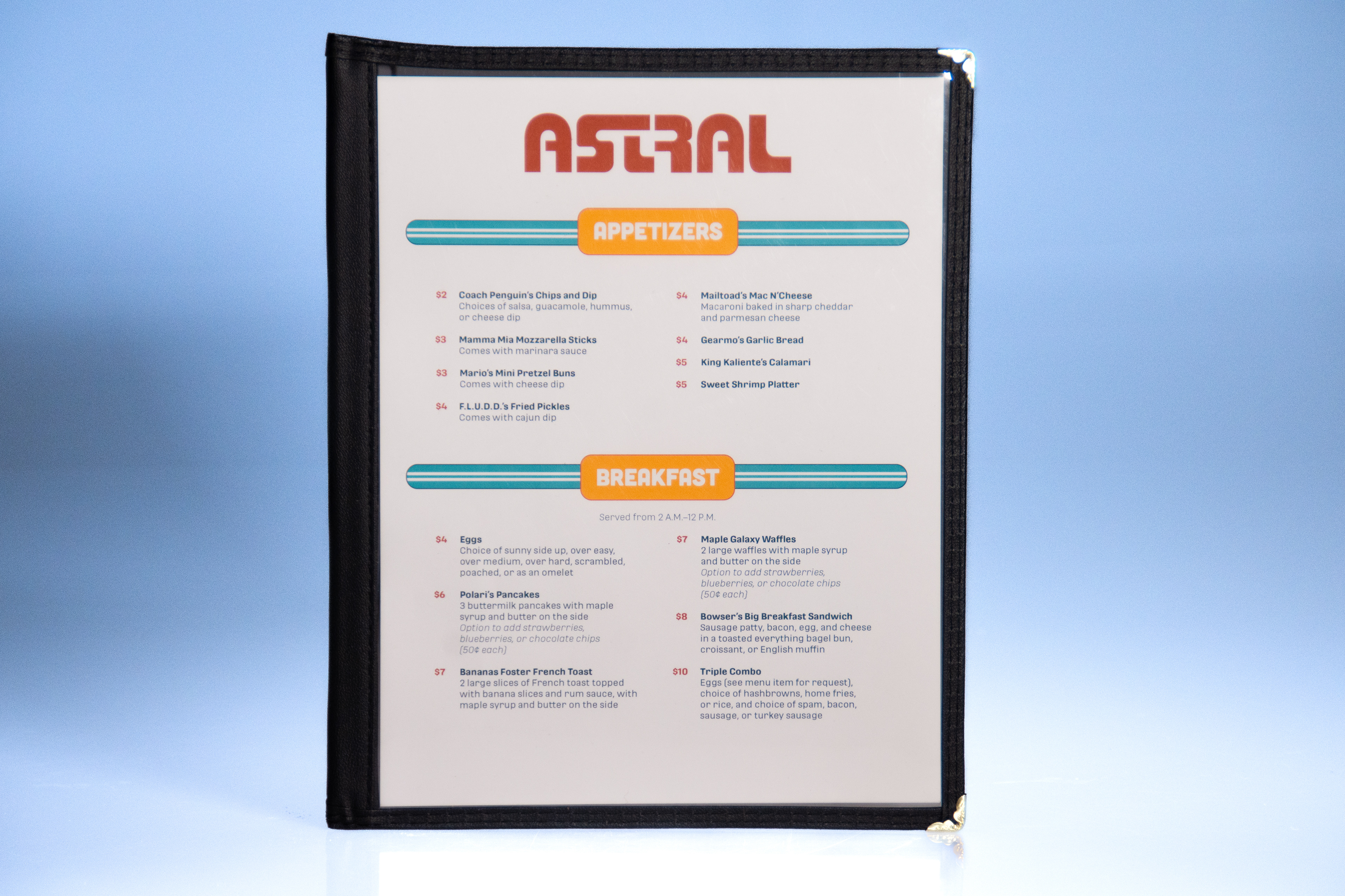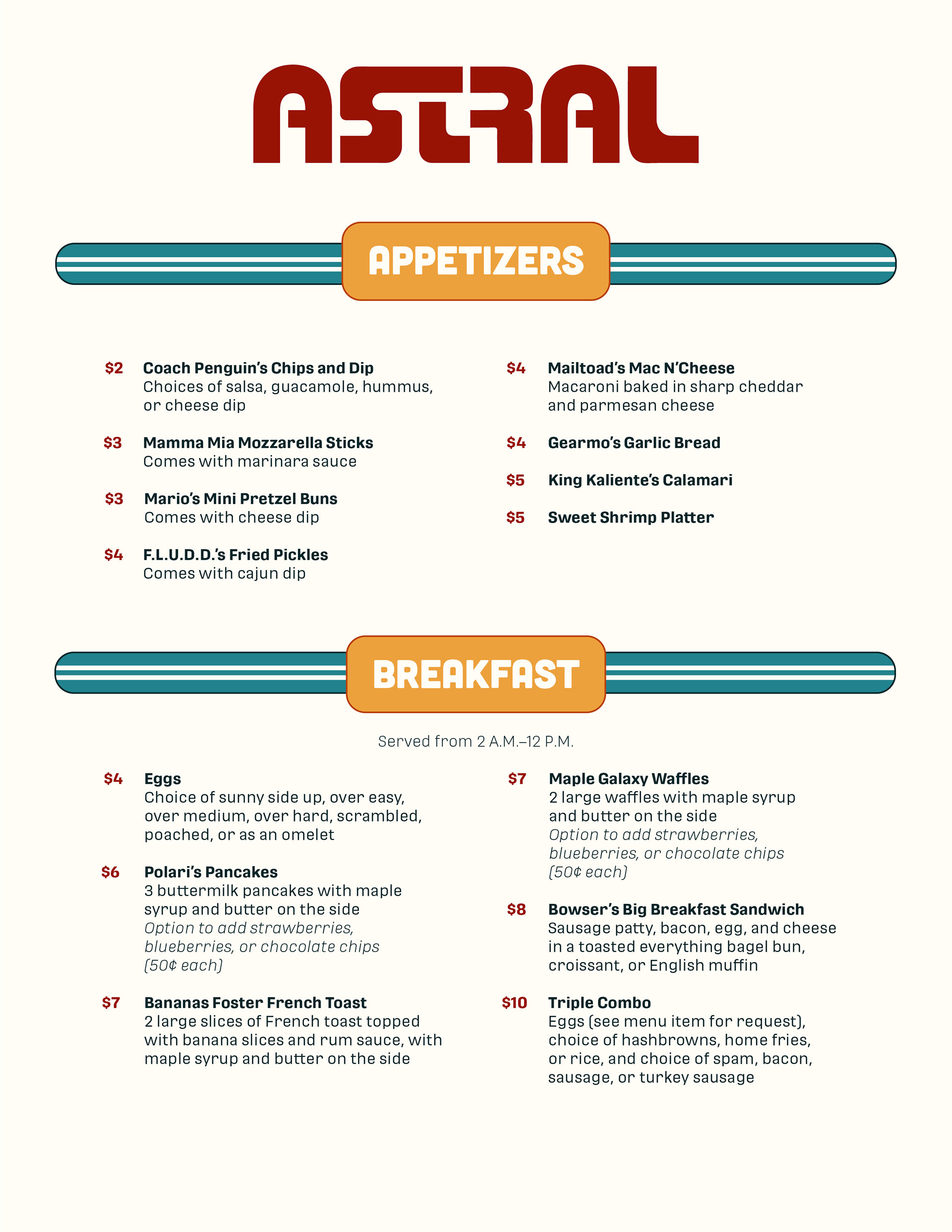 Astral is an American retro-themed diner, housed in the Comet Observatory of the Super Mario Galaxy video game universe. It is a rest-stop for all heroes, villains, and denizens of the multiverse. People come from far and wide in the galaxies for an early-morning breakfast, a quick bite, a relaxing lunch, or a family-friendly dinner.