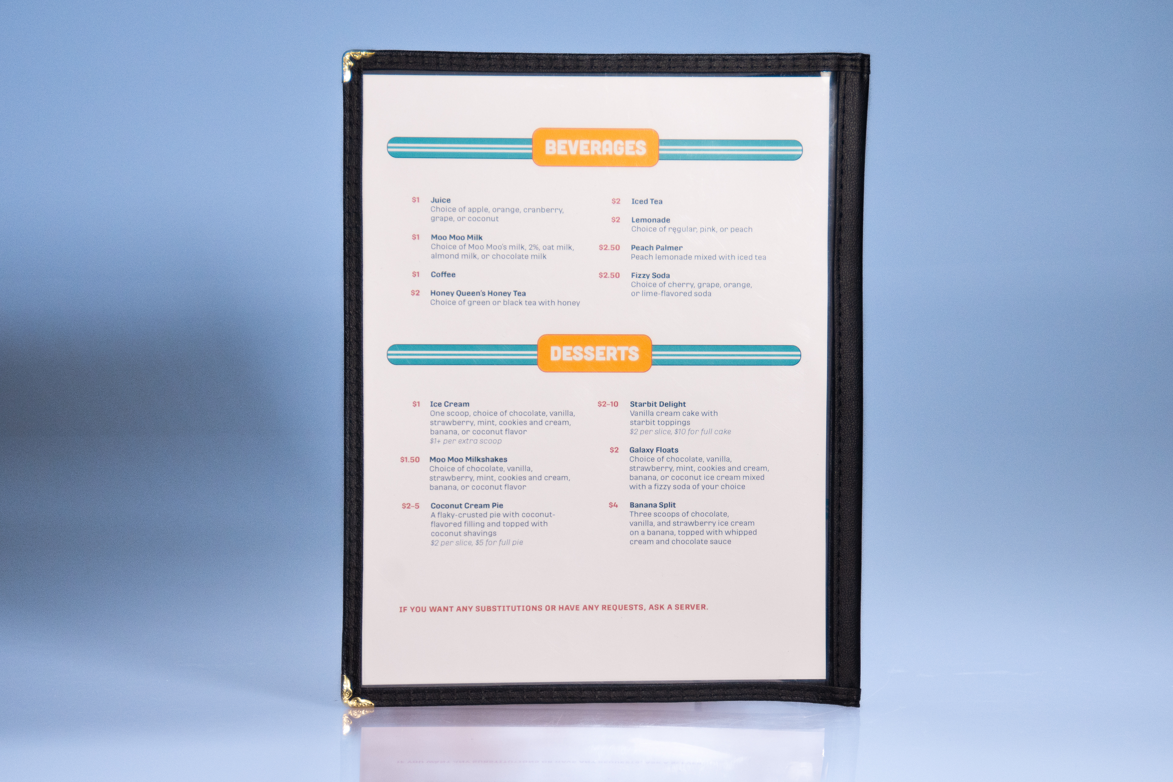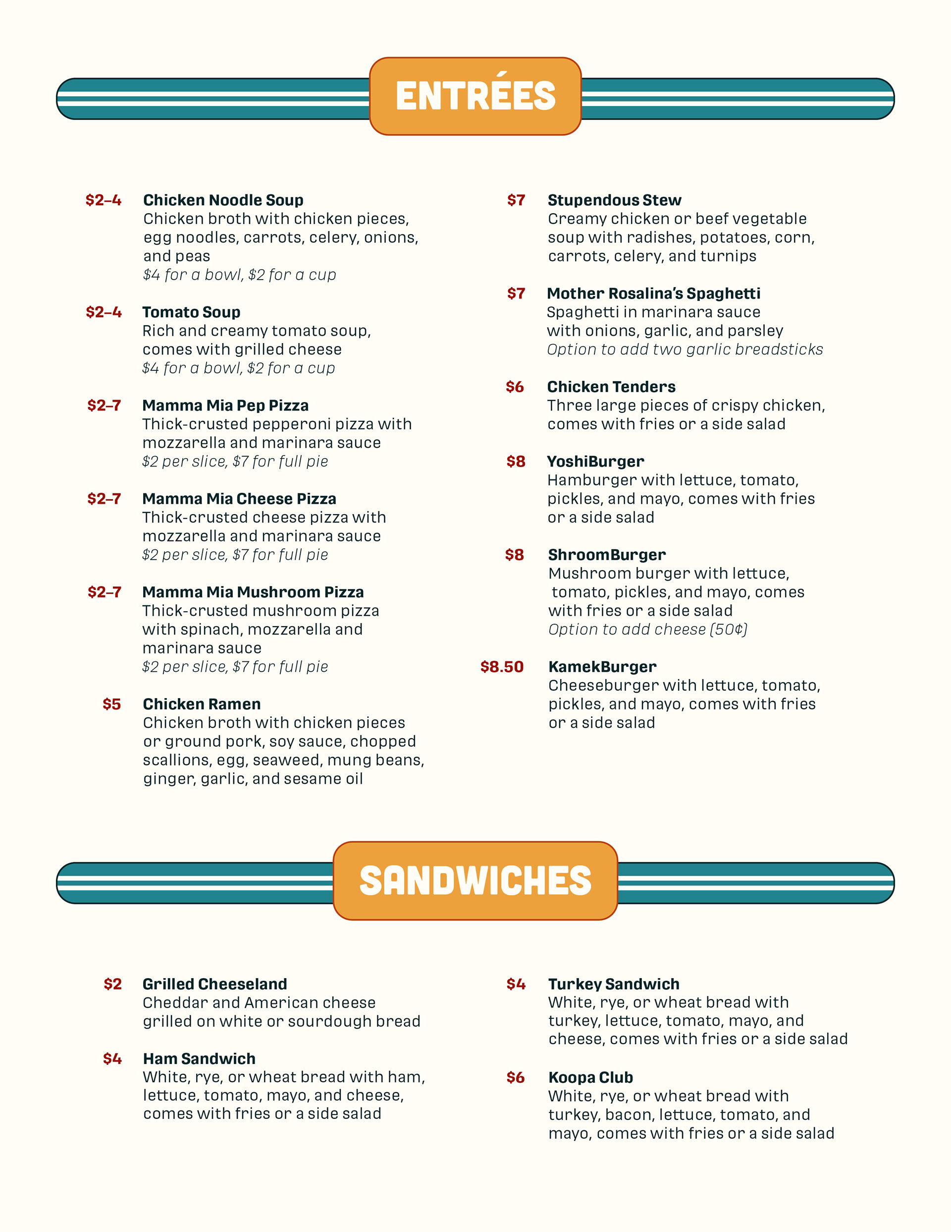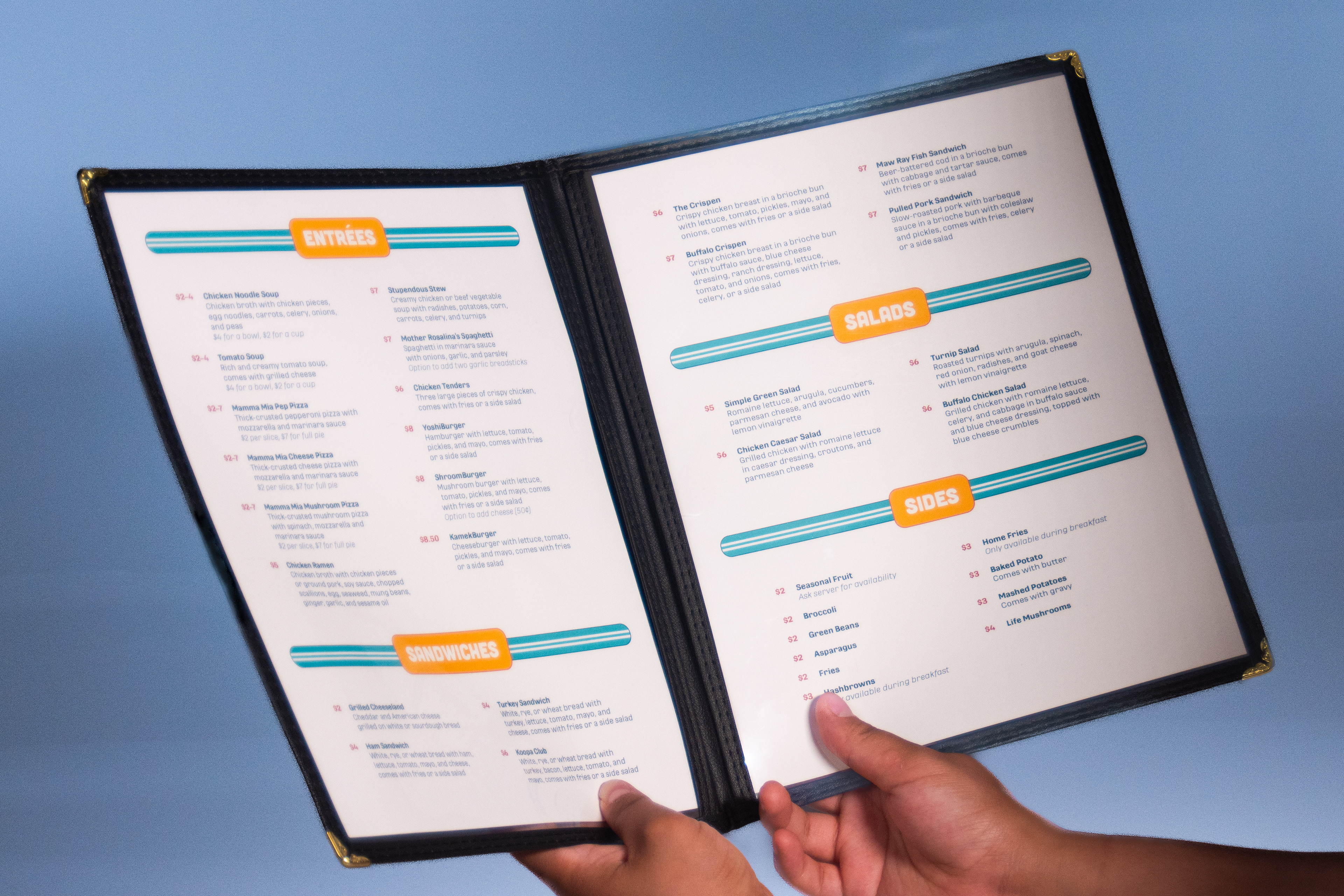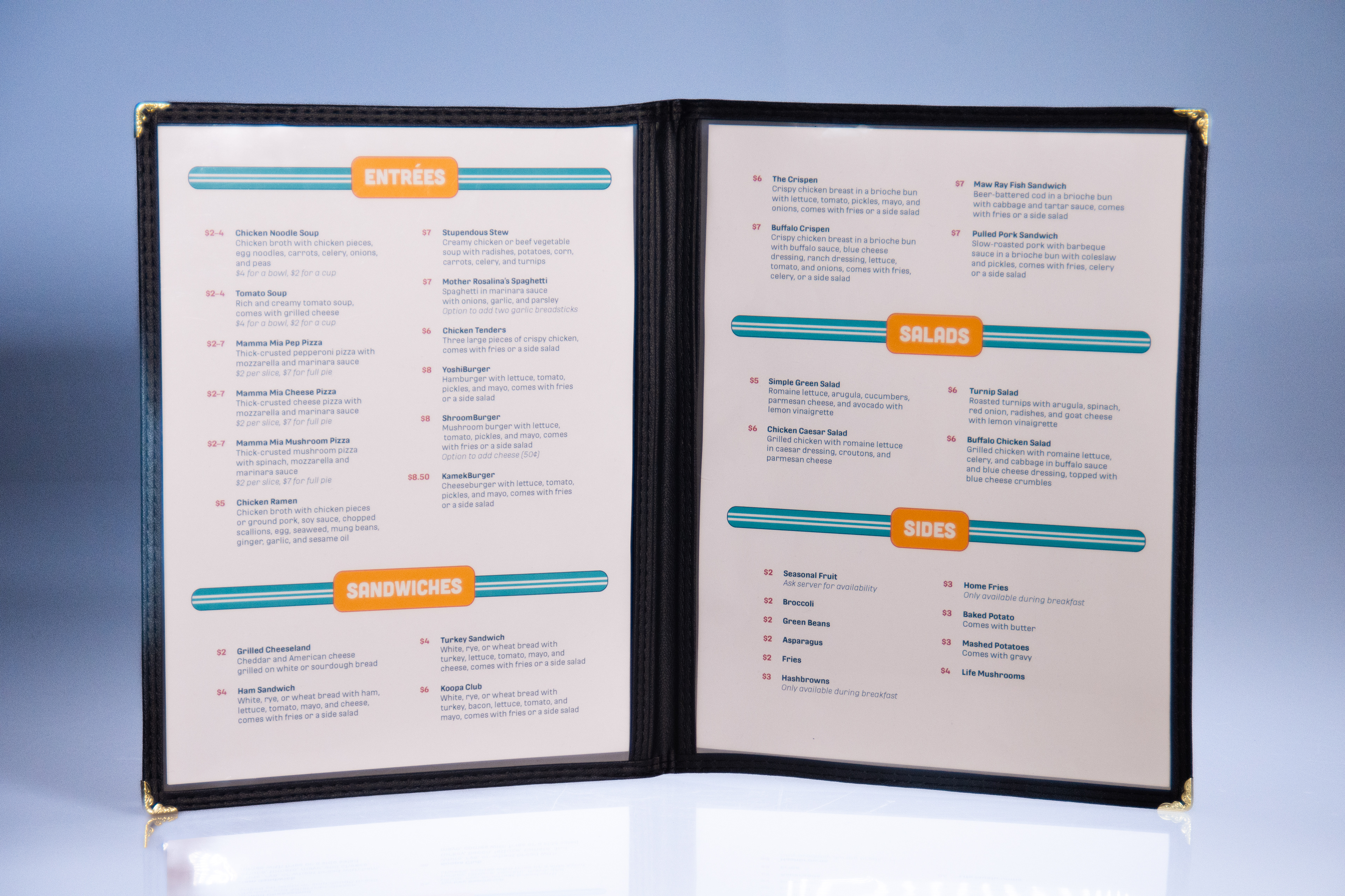 Going along with the restaurant's values, I settled for a simpler menu with plenty of choices, perfect for the diversity of customers that may come. When thinking in-universe, having a simpler menu works for regulars who want to return to the familiarity of the food and for newcomers who want to try new things.