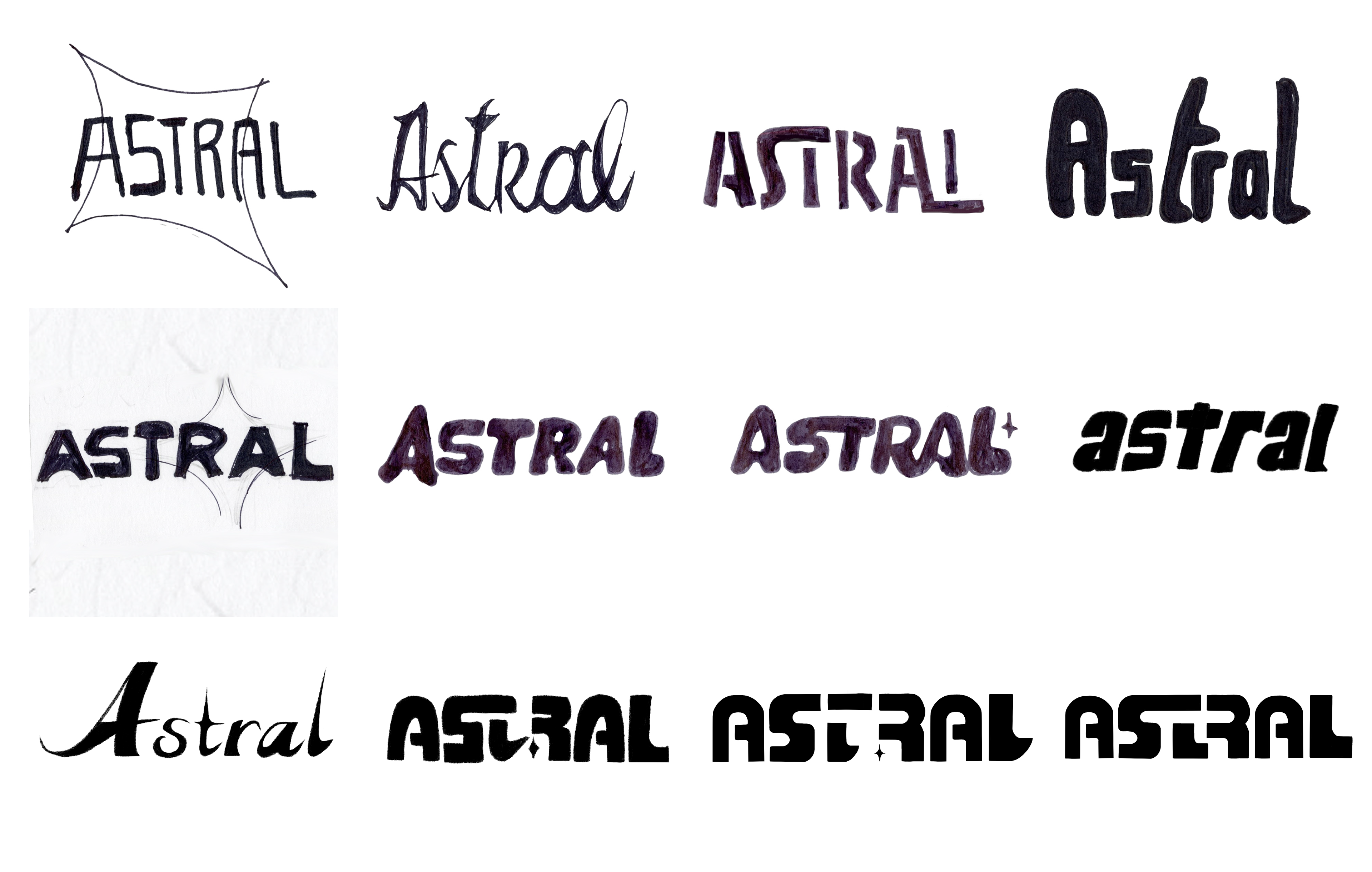 Using the restaurant's values of loyalty, community, and comfort, and combining it with typefaces from mid-century modern and retrofuturistic designs, I played around to see how those values could represent Astral's logo.